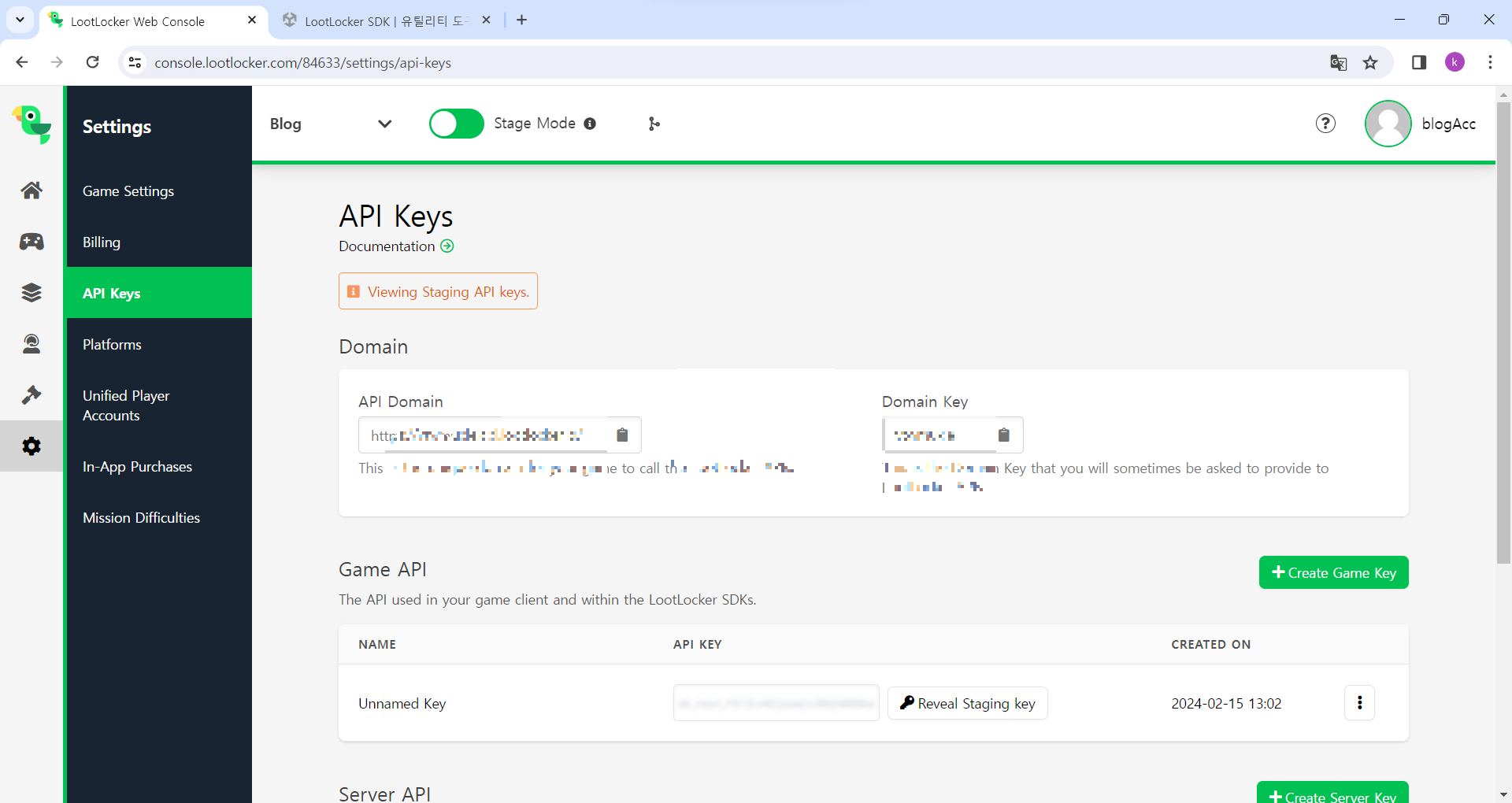 여기에 LootLocker 사이트 창에 나와있는 본인의 API키와 도메인키를 입력하시면 됩니다