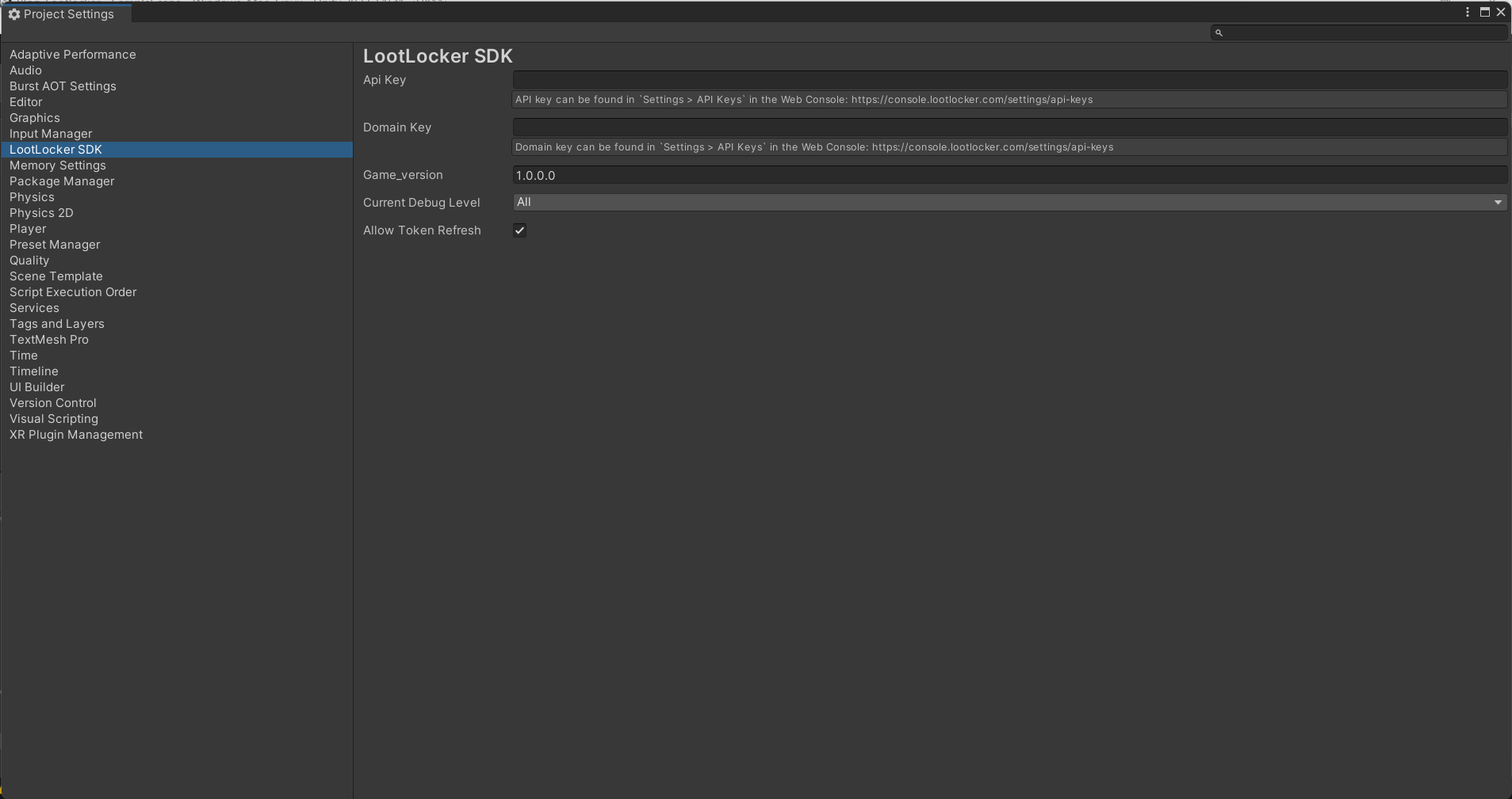 임포트가 된 이후 프로젝트세팅에서 LootLockerSDK창을 찾아주세요